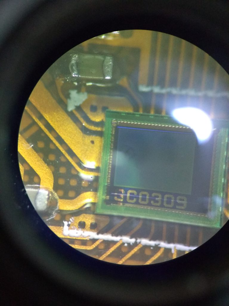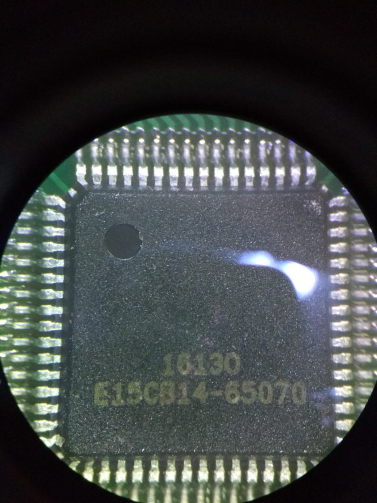 双眼実体顕微鏡を引っ張り出してきて,IC上の刻印を確認した所,”16130 E15CB14-65070″とありました(撮影が下手なのはご容赦ください).GoogleやBaiduで検索してみましたが,特にヒットしませんでした.このICの分解には失敗してしまったので,ウエハの写真はありません.同じアクションカムをもう一台買ってあるので,一通り遊んだらきちんと準備をした上でウエハの取り出しに挑戦するかもしれません.