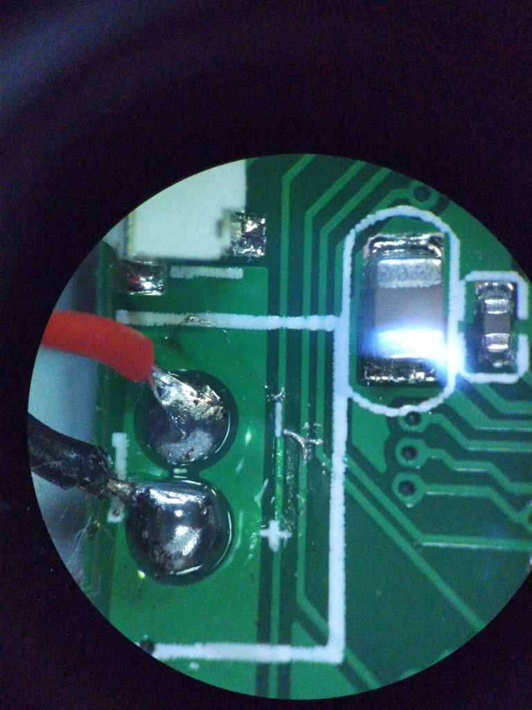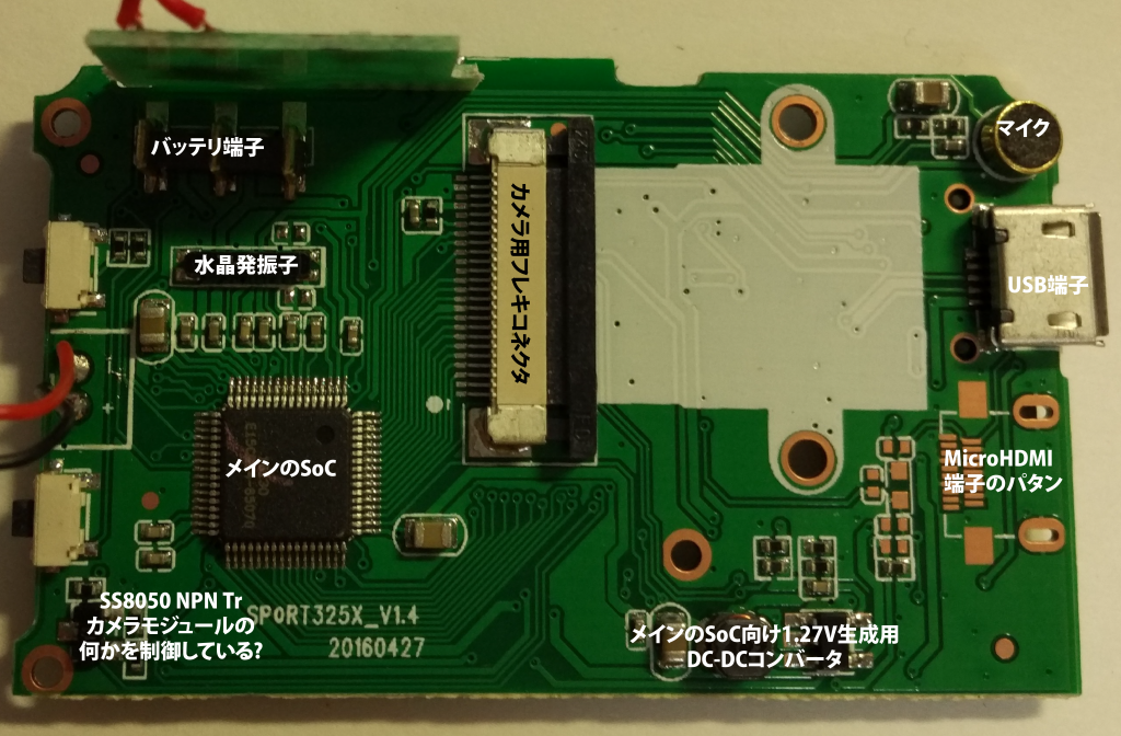 基板を眺めていて気になったのはこのハンダが跳ねた点くらいで,特に他に怪しい点はありませんでした.少なくともこの基板については「深センで700円のアクションカムを買った話」に出てくる基板工場で見たような,大電流によるパタン焼き切りをしたような雰囲気はありませんでした.
