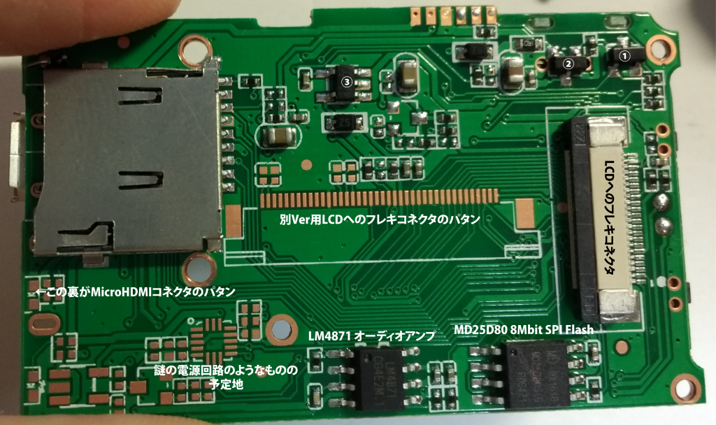 ここまで調べていて,振り返ってみるとリチウムイオンバッテリの充電ICがないということに気がついたのですが,基板を眺めると裏側の2.のトランジスタのそばに1Ωの抵抗があったので,それで電流の検出くらいはしていると思うことにします.バッテリ端子からは遠いのですが,未実装パタン群はUSB端子のそばなので,「実はそこが充電ICが実装されるスペースだが,ケチった結果もっと簡略化された回路になった」ということもあり得るかもしれません.