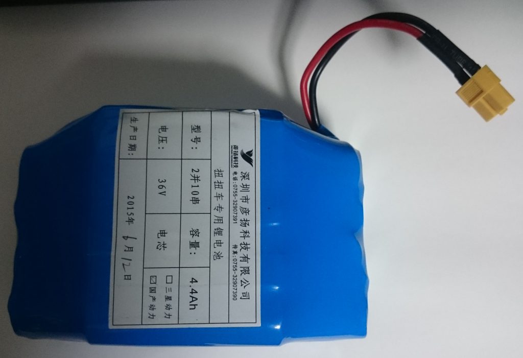電池パックの表面には「扭扭车专用锂电池」とあります.「扭扭车」が「ホバーボード」に対応するのだとは思いますが,深センの街なかでは「平衡车」表記を多く見かけた気がします.ちょっとググると,「扭扭车」はバランスを取らないで済むような電動の小型の車も表すようです.その次の「专用」は「専用」,「锂电池」は「リチウム電池」のことのようです.